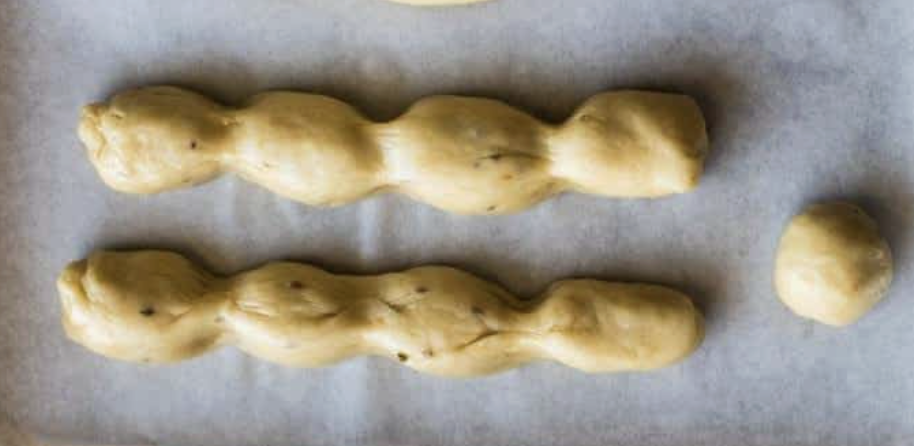 Dump the dough on a counter-top and give a longer/cylindrical shape, and divide the dough in 2 equal parts.